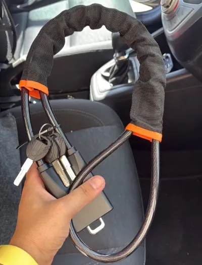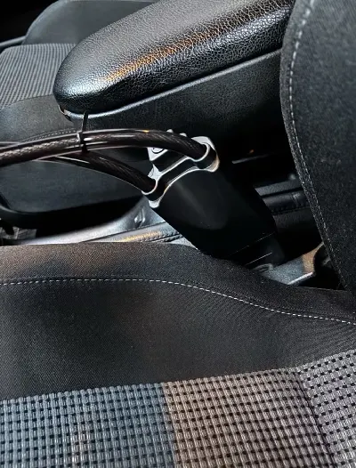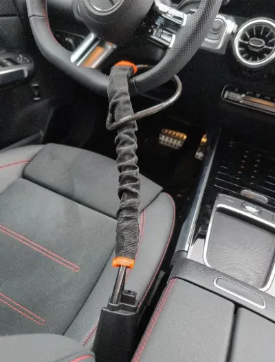 Sobald das System korrekt angebracht ist, wird das hochfeste Stahlseil durch das Lenkrad geführt und verhindert dessen Drehung vollständig. Dadurch wird das Fahrzeug praktisch unbeweglich gemacht. Gleichzeitig blockiert der Mechanismus den Entriegelungsknopf des Sicherheitsgurts, sodass sich das Schloss ohne passenden Schlüssel nicht lösen lässt.